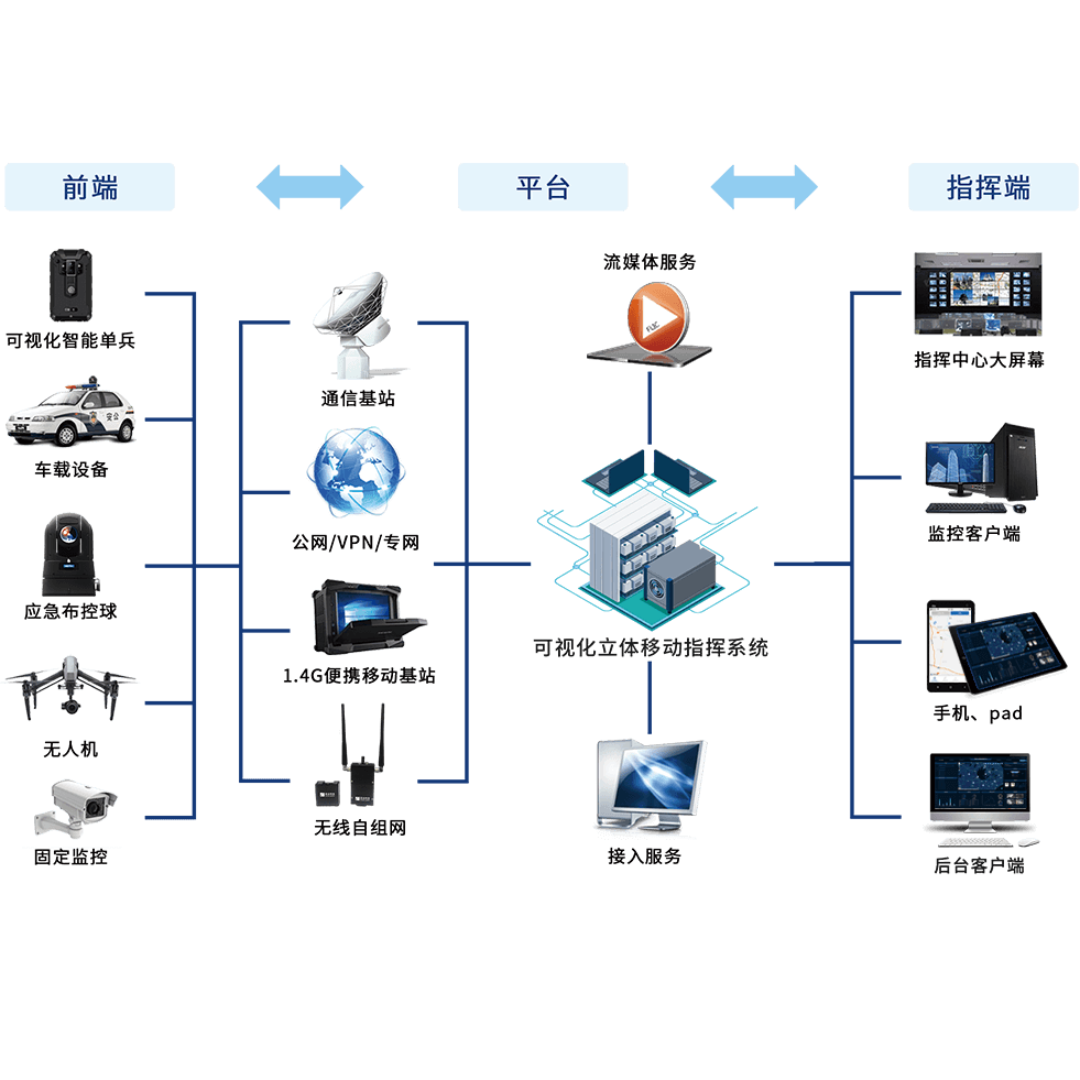 支持总部、现场临时的指挥中心搭建。产品覆盖指挥大屏、指挥平台、4G传输系统等。